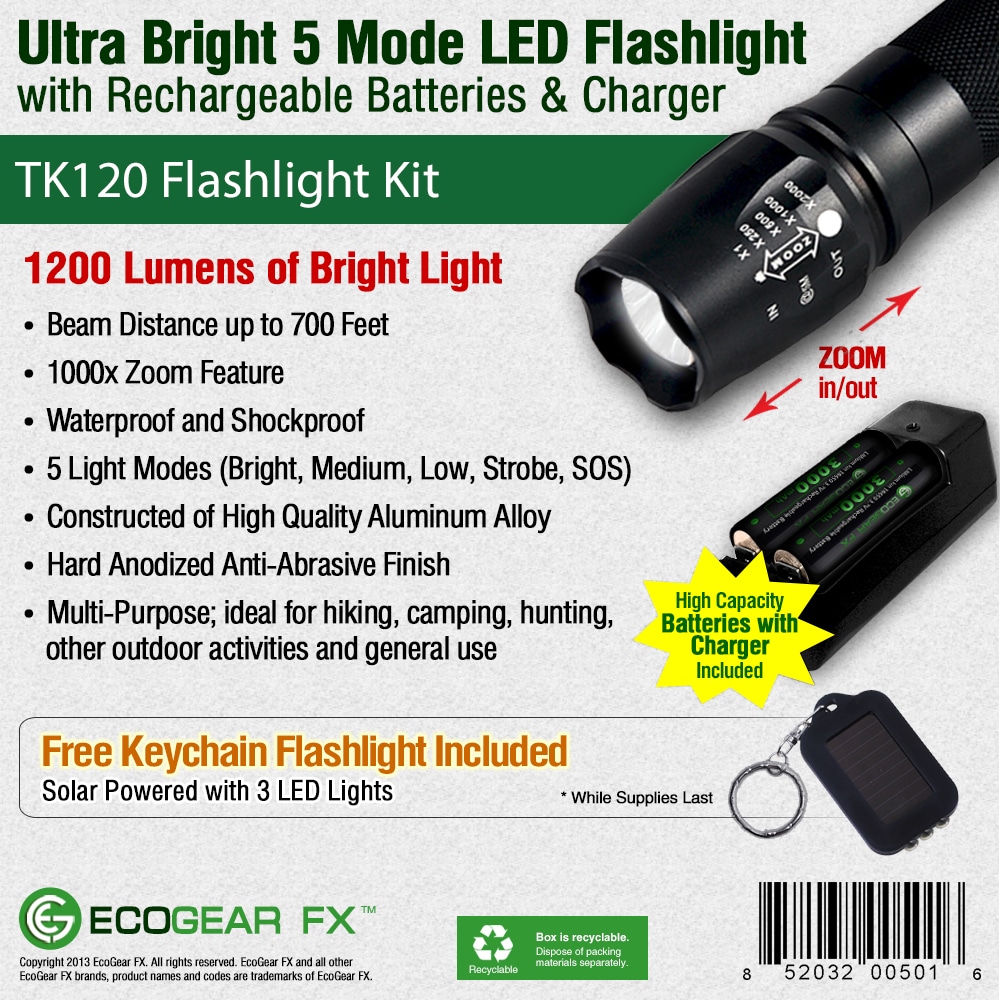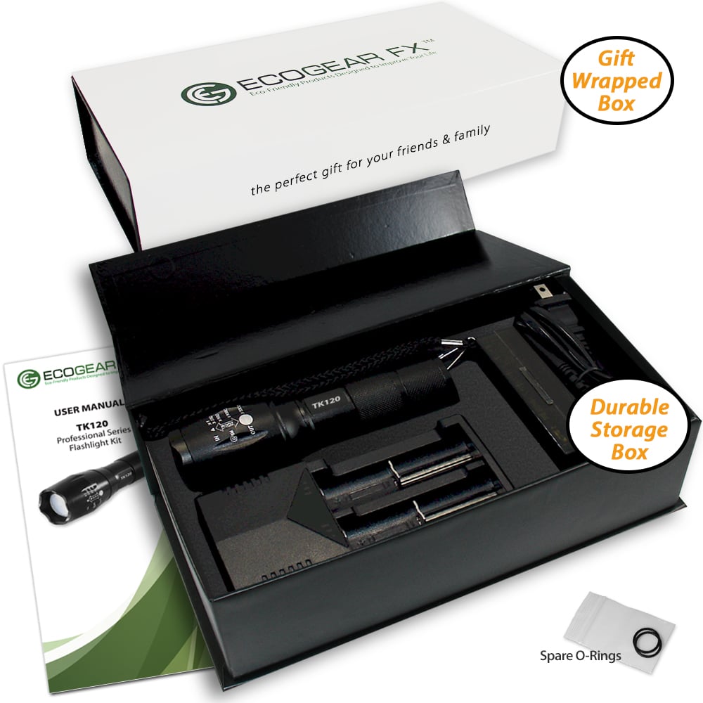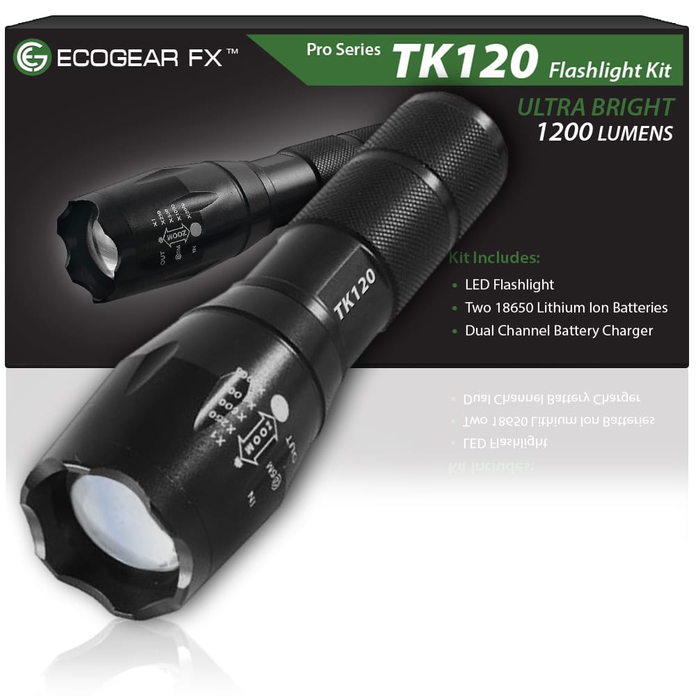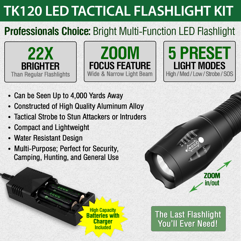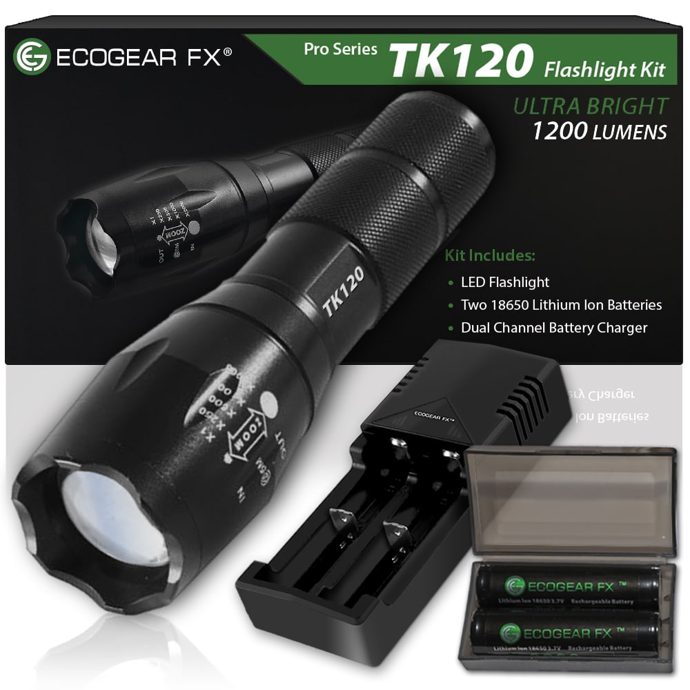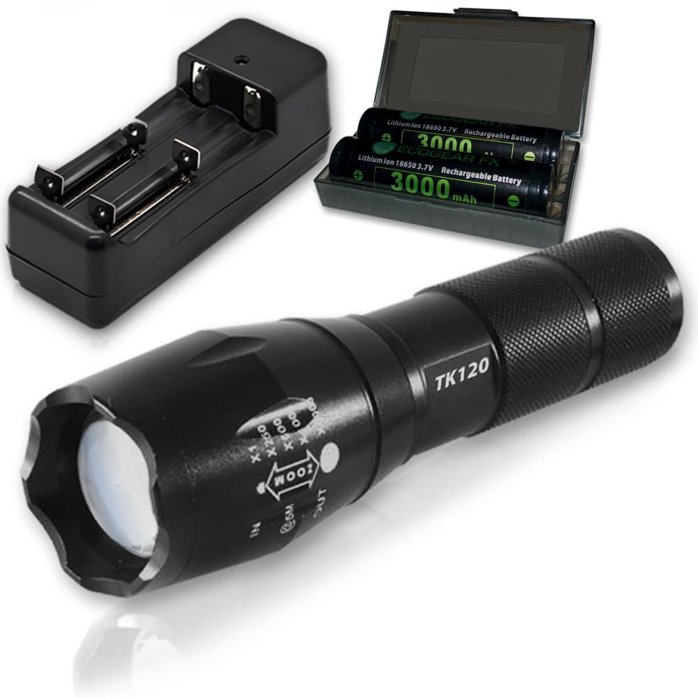 As an extremely rugged tactical flashlight, the TK120LED Flashlight Kit includes two high capacity lithium-ion rechargeable batteries and a rapid battery charger. Ideal for many situations and uses, the TK120 makes a perfect LED tactical flashlight with strobe. Not only is it great for professionals but makes a great flashlight kit for tactical situations, family camping, hunting trips, fishing and night patrols. It is a very useful LED emergency flashlight to aid in emergency assistance and natural disasters including earthquakes, hurricanes and storms.