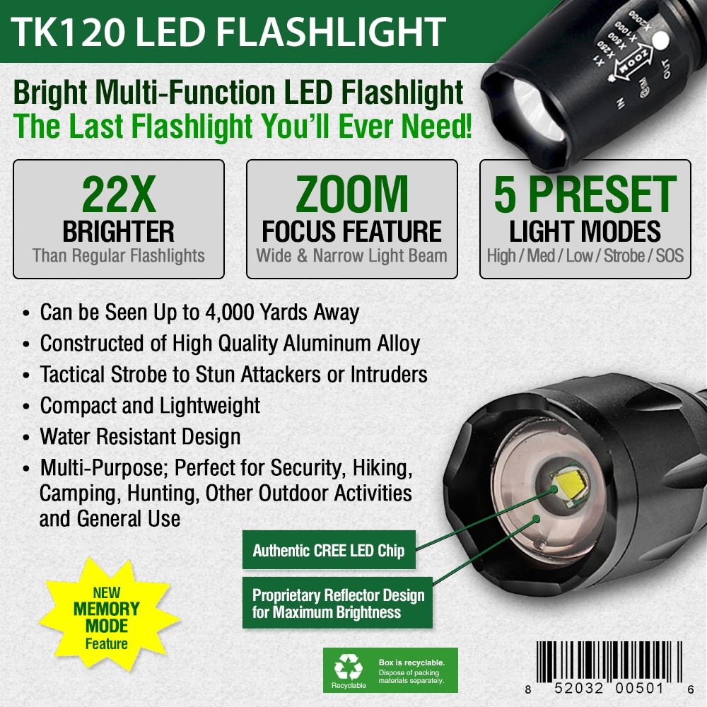 The TK120 LED Flashlight is a complete professional LED flashlight kit for home use, outdoor activities, security and professionals. Equipped with multiple light modes, the TK120 LED Tactical Flashlight delivers excellent light spread when using the zoom feature (adjustable focus). Constructed using high-quality standards, the TK120 Professional LED Flashlight is made of aircraft grade aluminum alloy with a hardened anodized finish. So when the going gets tough the TK120 Flashlight gives you high-strength and durability needed for nearly any situation.